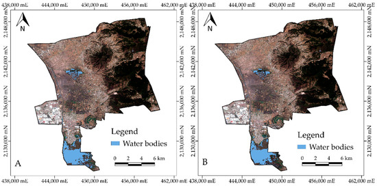 - In Phase 1, the coordinates (x, y) of a set of pixels representing the two target classes were obtained. This procedure was performed on a subset of the image of variable size to select pixels with greater detail. For this, three methods were used: (1) growth by region [36,37], (2) manual definition of the threshold, and (3) use of the entire subset. The method for manually defining the threshold and using the entire subset consisted of defining a threshold for binary segmentation based on analysis of the histogram of the subset and the graphic display. This procedure starts with the transformation of the input image to a single band. In the case of Sentinel-1 (SAR), only one polarization is used. Next, the histogram of the scene is calculated [7]. In the case of Sentinel-2, a limit value is defined that allows the separation of water bodies and that also allows a pixel-by-pixel validation on the RGB composite image. Before exporting the coordinates of the sampling pixels, the intra- and inter-class duplicates database was purged, based on the value of the RGB false-color pixels for the “non-water” class and backscatter (VV) values for the “water” class.