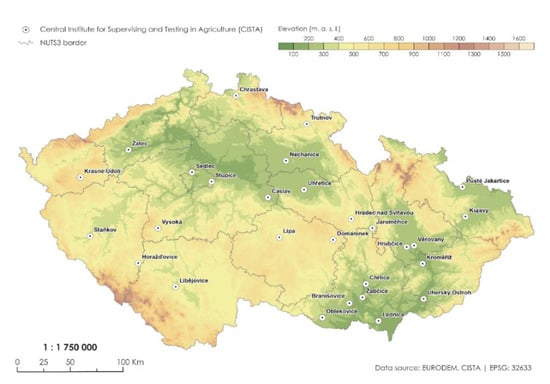 Phenological data from 28 stations in the Czech Republic at varying altitudes (from 171 to 647 m a.s.l.) were used in the present study, covering the period from 1961 to 2021. The experimental stations represent the soil and climatic conditions of the region; the same set of experimental fields was used in almost all cases. These data were visual ground-based phenological observations of winter wheat (Triticum aestivum L.) from official state trials of the registered and considered cultivars at small-plot experimental stations of the Central Institute for Supervising and Testing in Agriculture (Figure 1). Phenological dates were assessed by highly trained staff. Because the same set of 30–40 winter wheat cultivars (depending on the year) was grown at each site, the so-called standard cultivar phenological dates were used. The standard for the variety trials was always selected with respect to the previous standard cultivar. The dates of onset of three phenophases were evaluated: jointing (BBCH31), heading (BBCH51), and full ripeness (BBCH89). The completeness of data in individual years depended on each station and phenophase. For some stations, data were available for the entire period of 1961–2021, whereas for some stations, data were unavailable in some years. In most cases, data were available for the last thirty years or more, but at several stations, only a short-term series of observations (approx. 11–17 years) was available. Long-term series of observations are generally used as part of phenological studies (approx. 20–30 years), but in this study, a short-term series of observations was also used in order to include as much accurate information as possible about the onsets of phenophases in the model in an effort to increase the spatial resolution of the stations. The geographical coordinates of all stations and the availability of phenological data at each of them are shown in Table 1. A detailed overview of the available years is shown in Table A1.