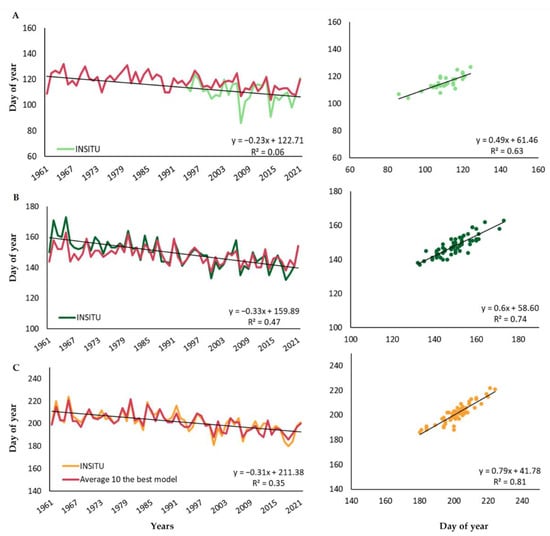 Comparison between the observed and modeled jointing (A), heading (B), and full ripeness (C) phenophases for Chrlice station. The red curves in the line graphs represent the modeled onsets of phenophases in the period from 1961 to 2021, and the colored curves (light green, dark green, and yellow) represent the ground-observed onsets of phenophases.
