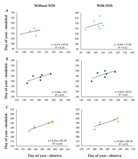 Based on the NDVI and EVI2 values, the SOS was determined for eight experimental stations in individual years during the period from 2015 to 2020 for each phenophase. After including SOS in the model, the RMSE value was calculated for the modeled onsets of phenophases, based on which the best threshold of Z-score was determined. Among the average values of eight stations, the best threshold for both vegetation indices was found to have a Z-score of 0. The average RMSE value for this threshold moved within the range of 6.2 to 15.2 (Table 4). The lowest average RMSE value was found for the full ripeness phenophase by using the SOS determined by EVI2. For the jointing and heading phenophases, improved results were obtained by using SOS from NDVI; nevertheless, the average RMSE values were higher than for the full ripeness phenophase. The best threshold Z-score and corresponding RMSE value differed for individual stations; an overview is shown in Table A2 and Table A3, highlighting that for the jointing phenophase and full ripeness phenophase at some stations, the accuracy of the model was improved when SOS was included relative to when it was excluded. A comparison of the observed and modeled values with and without the start of the season is displayed for the Chrlice station for illustration in Figure 3.