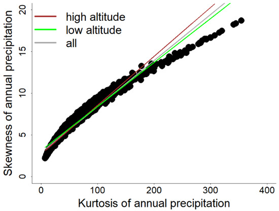 I first examined the relationship between the skewness and kurtosis of annual precipitation to understand the precipitation distributional characteristics across the QTP (Figure 2). The skewness and kurtosis may vary with environmental conditions. Environmental conditions are mirrored by altitudinal differences. A threshold of 3500 m was used to differentiate high altitudes and low altitudes. High altitudes (>3500 m) and low altitudes (<3500 m) are characterized by different sensitivities to the intra-annual variability of daily precipitation on the QTP [21]. The intra-annual variability of daily precipitation greatly impacts the magnitude and frequency of precipitation extremes.