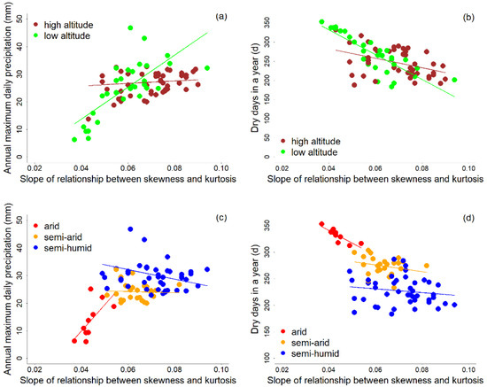 Effects of precipitation extremes on skewness–kurtosis interactions of annual precipitation distribution. Precipitation extremes were shown by two indices, namely annual maximum daily precipitation and the number of dry days in a year. The effects of both indices were assessed in terms of various altitudes (a,b) and climate zones (c,d).
