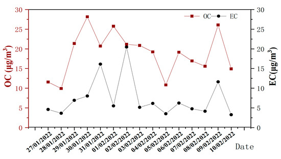 Distribution of OC and EC in PM2.5 during the sampling period.