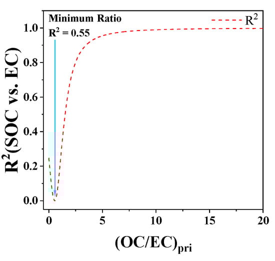 Relationship between the correlation coefficient R2 of SOC and EC and the assumed (OC/EC)pri.