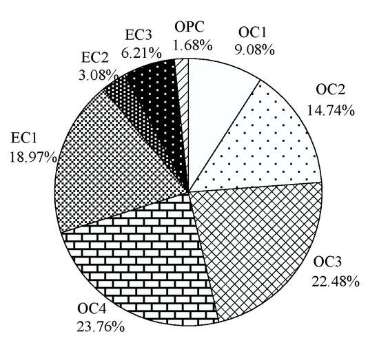 The proportions of the eight carbon fractions in TC are shown in Figure 4. The four carbon fractions with high proportions were OC4, OC3, EC1, and OC2, accounting for 23.76, 22.48, 18.97, and 14.74% of TC, respectively. The average concentrations were 5.96, 6.30, 5.47, and 3.91 μg/m³, respectively. One part of OC2, OC3, and OC4 originated from the secondary generation, and the other part was from the primary emission of the coal combustion. EC1 was mainly from incomplete combustion of the coal and biomass. Therefore, it was considered that the carbonaceous aerosol in the sampling area was affected by the secondary sources and primary sources of the coal and biomass combustion.