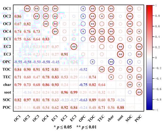 Figure 5 shows the correlation between the different carbon fractions. There was a strong correlation between the four OC fractions and SOC (p < 0.01), indicating that the four OC fractions were significantly affected by the secondary sources. In addition, the strong correlation between char, EC1, and the four OC fractions also indicated that local primary emission sources have an impact on char, EC1, and the four OC fractions in carbonaceous aerosols. The results of the correlation between the eight carbon components in this study were similar to the high correlations between char and OC in rural winters in the Ganges Plain, India, which were related to the burning of raw coal and biomass [25].