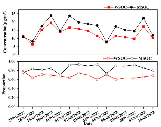 Variations of WSOC and MSOC concentrations and their proportion in TOC.