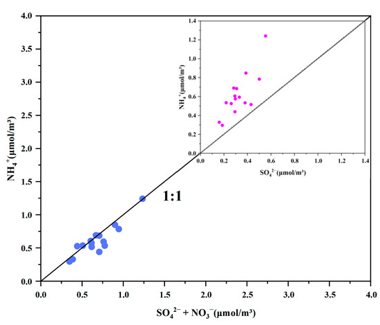 Figure 7 shows that the scatter points (purple dots) of the equivalent concentration of NH4+ and SO42− were distributed above the 1:1 line, indicating that NH4+ was sufficient to neutralise SO42−, and both mainly existed in the form of (NH4)2SO4. The equivalent concentration scatter points (blue dots) of NH4+ and SO42− + NO3− were partly distributed above the 1:1 line and the other part were below the 1:1 line, so NH4+ was not enough to neutralise all NO3−.