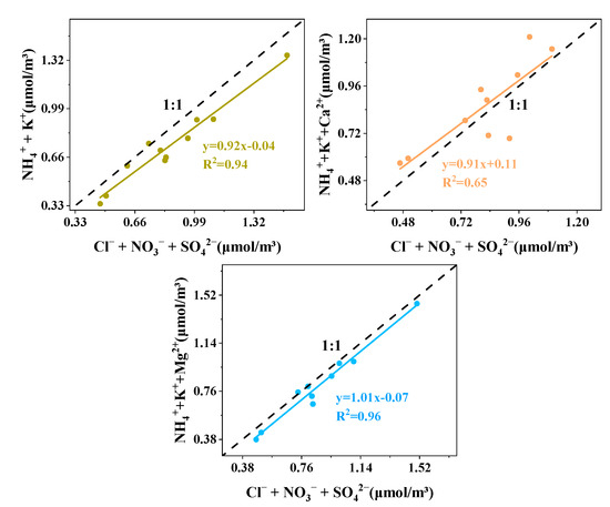 Figure 8 shows the fitting relationship between the equivalent concentration of three cations and the equivalent concentration of some anions. When the cation was NH4+ + K+, the scatter points were distributed far below the 1:1 line and were far away from the 1:1 line. The slope of the fitting line was 0.92 and the correlation was strong (R2 = 0.94). When the cation was NH4+ + K+ + Ca2+, most of the scatter points were distributed above the 1:1 line and the slope of the fitted line was 0.91, but the correlation coefficient (R2 = 0.65) was smaller. When the cation was NH4+ + K+ + Mg2+, the slope of the fitted straight line of the equivalent concentration of the three anions and the three cations was closest to 1:1 (R2 = 0.96), showing that the equivalent of the anions and the cations was almost balanced. Therefore, the combination of anions and cations was likely to result in NH4+ being able to neutralise most of SO42− and NO3− to form (NH4)2SO4 and NH4NO3, while K+ and Mg2+ existed in the form of KCl and MgCl2.