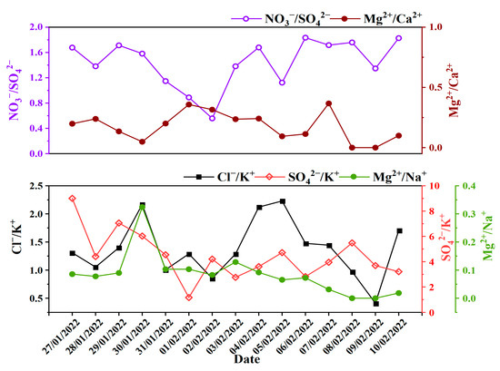 The typical ion ratios in this study are shown in Figure 9. The average ratio of NO3−/SO42− was 1.44, which indicates that the PM2.5 in the region was not only affected by local sources, but also by the increasing mobile sources of motor vehicles at the end of the year and during the Spring Festival. In addition, the sampling site was surrounded by farmland, the terrain was flat, and there was no large shelter around. There was a provincial road 1.5 km away from the south of the sampling site, and there were rural roads 100 m away from the east, west, south, and north of the sampling site. The influence of motor vehicle exhaust cannot be ignored. The average ratio of Mg2+/Ca2+ was 0.18, which was higher than that of soil (0.09). It has been shown that Mg2+ and K+ also had a good correlation; therefore, the reason for the high Mg2+/Ca2+ ratio might be that some Mg2+ came from biomass combustion sources [57].