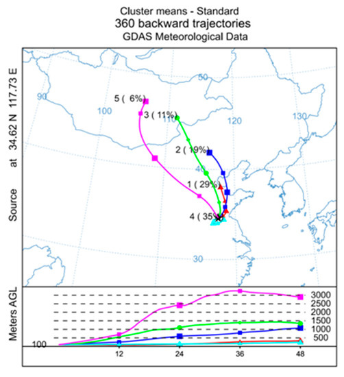 A total of 360 backward trajectories were obtained after 48 h of backward trajectory simulation. After the clustering analysis, there were five clusters classified. As shown in Figure 10, Cluster 1 accounted for 29% of the total atmosphere mass, mainly from Binzhou City near the Bohai Sea in the northern part of Shandong Province. It went south through Shandong Province to reach the sampling site, and the initial height was less than 500 m, which belongs to the low atmosphere mass, and the height change was small during the movement. Cluster 2 accounted for 19% of the total atmosphere mass, mainly from Inner Mongolia. It passed through the Beijing–Tianjin–Hebei region and the Bohai Sea, and then went south to the sampling site. The initial height of the atmospheric mass was about 1000 m, which belongs to the middle- and high-altitude atmosphere mass. Cluster 3 and Cluster 5 together accounted for 17% of the total atmosphere mass, and both originated from Outer Mongolia. The initial height of Cluster 3 was 1000 m, and the initial height of Cluster 5 was about 3000 m. Cluster 4 accounted for the largest proportion of 35%, mainly from the junction of Shandong and Jiangsu, with a lower starting height (500 m) similar to Cluster 1.
