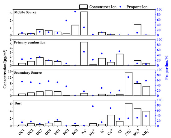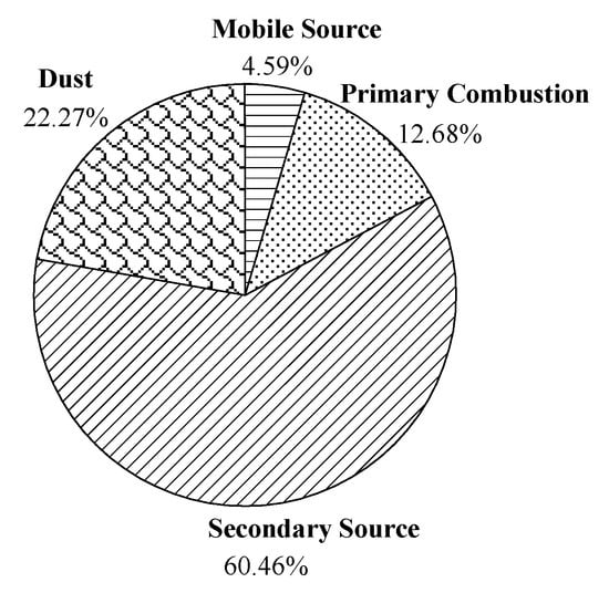 Figure 11 and Figure 12 show the source component spectrum and the source contribution rate of the PMF model analysis. The characteristic components of the first factor included EC2 and EC3. EC2 and EC3 are often considered tracers of diesel vehicles [52], so they were identified as the contribution of mobile sources (4.59%). The characteristic components of the second factor were Cl−, K+, and Na+, which could be identified as the contribution of the primary combustion source (12.68%). The characteristic components of the third factor included OC1, OC2, OC3, OC4, EC1, NO3−, SO42−, and NH4+. The four OC fractions were significantly correlated with SOC (see Section 3.2.3), while NO3−, SO42−, and NH4+ were secondary inorganic ions. Therefore, the third factor was identified as the contribution of secondary sources that bring secondary organic and secondary inorganic aerosols (60.46%). The fourth factor was characterised by Ca2+ and Mg2+, which can be identified as dust source contributions (22.26%).