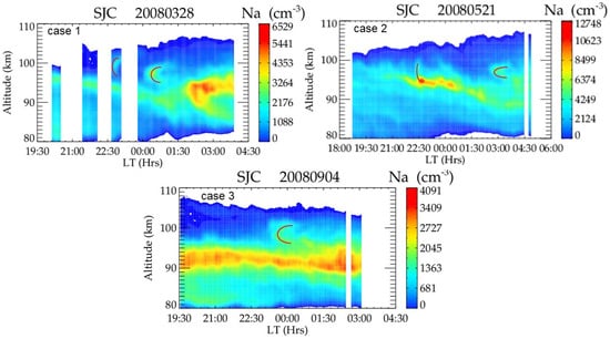 In Figure 1, we can see the well-defined C-structures, highlighted with a red line at the top of the Na layer for all the cases which are very similar to those reported by other works e.g., [,,]. Besides the data interruptions, we can identify two C-structures in case 1, on the night of 28–29 March 2008. The first one started at 22:40 LT around 98 km with a vertical range of 5 km and lasted for 20 min. The second one (case 2) began at 00:00 LT around 97 km, with a vertical range of 6 km, and lasted for 90 min. Two C-shapes can also be identified in case 2, during the night of 21–22 May 2008. The first structure arises at 22:12 LT at around 98 km, and we can see the density enhancement as upward and downward, covering a total of 5 km vertical range, lasting for 36 min. The second enhancement occurred on 02:18 LT at around 97 km, with a similar 5 km vertical range, but it lasted twice as long as the first (72 min), and the branches are better visualized. Unlike the two previous cases, in case 3, only one structure can be identified on 4 September 2008, around 98 km at 23:30 LT, lasting for one hour and with a 7 km vertical range.