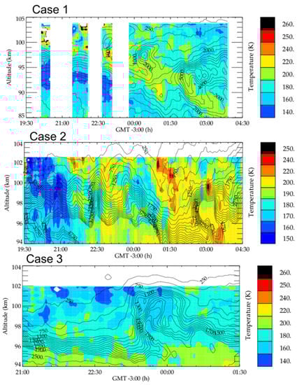 Height-time evolution of Temperature measured by Na-LIDAR for the three cases reported in Figure 1. Overplotted contours represent Na concentrations. Case 1 represents data measured on 28–29 March 2008; Case 2: 21–22 May 2008 and Case 3: 4–5 September 2008.