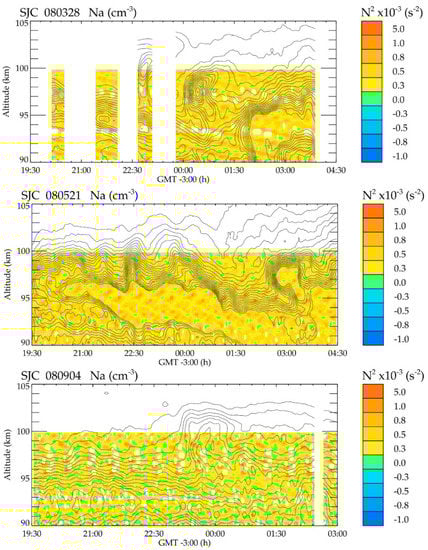 The height and time evolution plots of temperature measured for those three events are presented in Figure 2. The contours represent the overplotted Na density concentrations to identify better the location of the C-type events and the temperature around them. We can see in all the cases that the temperatures inside the structures are lower than in the borders. Moreover, it seems that there is a negative temperature gradient of around 20 K from the lower border to the inner part of the structure. For example, the temperature inside the first structure in case 1, as shown in Figure 2, is 160 K and increases to 180 K at the lower border surroundings; the second shows an inner temperature of 180 K and increases to 200 K at the bottom. In Figure 2, case 2, the inside temperature for the two structures is around 180 K, ranging from 190 K to 200 K outside, mainly compared to the bottom of the structure. In Figure 2, in case 3, the inside temperature is 160 K, and the outside is around 180 K. Maps showing the height and time intensity of are shown in Figure 3. Note that all C-type structures presented positive values of in their area, which is a convective stability indication. Besides these positive values, they are also close to zero inside the structure, which means a limit for instability conditions. The negative vertical temperature gradients shown in Figure 2 are the most probable cause of these convective instability occurrences.