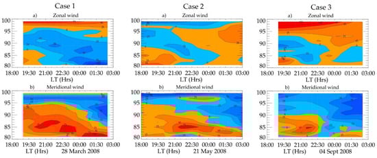 Zonal (Upper panels) and Meridional (Bottom panels) winds measured at Cachoeira Paulista at the time of C-type events on 28–29 March 2008 (Case 1); 21–22 May 2008 (Case 2) and 4–5 September 2008 (Case 3). Cold colors represent negative (Westward and Southward) values and hot colors represent positive values of wind (Eastward and Northward). Each contour corresponds to 25 m/s.