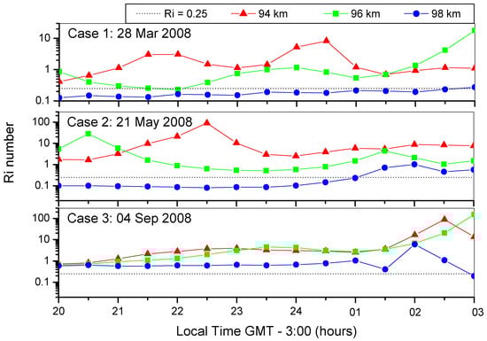 Figure 4 presents zonal and meridional winds’ height and time color contours over CP. Each contour represents a module of 25 m/s wind velocity. The winds vary greatly in a few kilometers of altitude over 94 km, where the C-structures occurred, indicating strong vertical wind shear. We calculated the vertical shear of horizontal wind, as expressed in the denominator of Equation (1). The values reached a minimum of 40 m/s/km in case 1, 35 m/s/km in case 2, and 20 m/s/km in case 3. These strong values of the vertical wind gradients trigger dynamical instability and can be evaluated by the number, presented in Figure 5. Observe that the drops to values below 0.25 at 98 km in cases 1 and 2 for almost the whole night, suggesting the presence of turbulence.