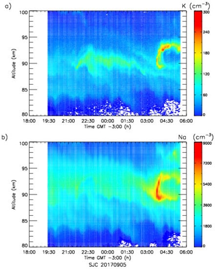- Andrioli, V.F.; Xu, J.; Batista, P.P.; Pimenta, A.A.; Martins, M.P.P.; Savio, S.; Targon, C.G.; Yang, G.; Jiao, J.; Wang, C.; et al. Simultaneous observation of sporadic potassium and sodium layers over São José dos Campos, Brazil (23.1° S, 45.9° W). J. Geophys. Res. 2021, 126, e2020JA028890. [Google Scholar] [CrossRef]