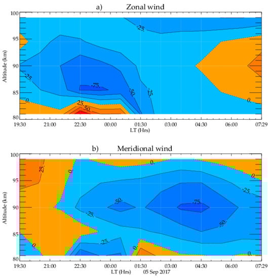 (a) Zonal and (b) meridional wind measured by all-sky meteor radar at Cachoeira Paulista on 5 September 2017.
