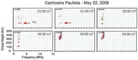 Ionospheric Es layer occurrence was evaluated using data from the Digisonde installed at CP. This equipment is a radar that transmits radio waves continuously into the ionosphere ranging from 1 to 30 MHz []. We manually checked the data every 10 min using the SAO-Explorer software since significant discrepancies can be found between the automatically scaled and the correct values over the Brazilian stations []. The ionosondes provide the ionospheric profile in graphs of frequency versus virtual height, from which it is possible to obtain the desired parameters.