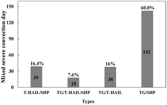 Figure 3b shows the monthly variation of compound severe convection. The compound severe convection mainly occurred in spring and summer, most of which occurred in July, followed by August and April. In addition, there were seasonal differences in the types of compound severe convection. The primary type of compound severe convection in spring was thunderstorm accompanied by hail (32 days), followed by thunderstorm accompanied by short-term heavy precipitation (31 days), and finally, the three types appeared simultaneously (24 days). In summer, the main type of compound severe convection was thunderstorm accompanied by short-term heavy precipitation (113 days), and there were few other types.