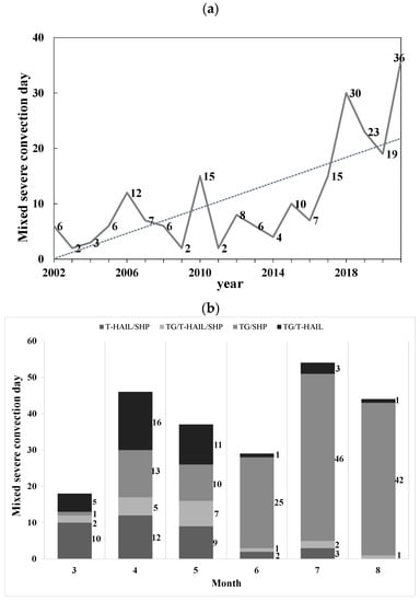 Figure 3a shows the interannual variation of the compound severe convection. The frequency of the compound severe convective weather in Hunan shows an upward trend. The frequency of compound severe convection in Hunan shows an upward trend, especially after 2017. In 2018, 2019 and 2021, The compound severe convective weather occurrence exceeded 20 days, and 2021 was the most frequent, with 36 days. Yao et al. [] pointed out that short-term heavy precipitation clearly increased year by year. A total of 84% of the compound severe convective weather was related to short-term heavy precipitation, so the compound severe convective weather also showed the same trend.