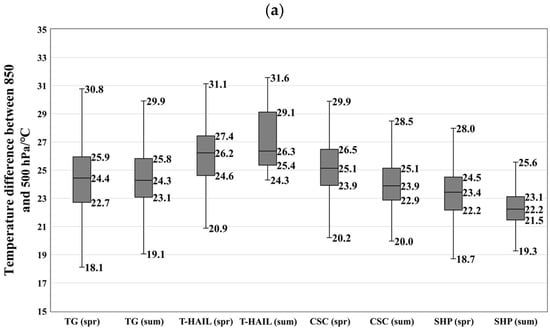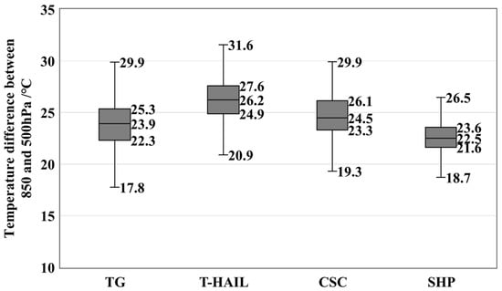 Thunderstorms mainly occur under unstable conditions, and static instability is usually represented by a temperature difference between 850 and 500 hPa. The greater the difference, the stronger the instability [,,]. From the median values of the temperature difference between 850 and 500 hPa for different types of severe convective weather (Figure 4), thermal hail was the highest, followed by compound severe convection and thunderstorm gale, and short-term heavy precipitation was the lowest. This shows that stratification is most unstable when thermal hail occurs. The range from the 25th percentile to the 75th percentile of the temperature difference between 850 and 500 hPa of different types of severe convection was relatively concentrated: within 3 °C.