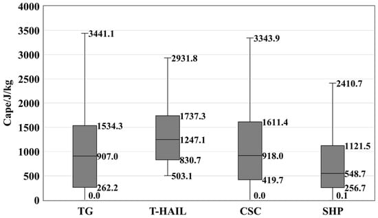 CAPE is the vertical integral of the energy generated by the positive buoyancy when the air parcel rises adiabatically. The increase of CAPE indicates the strengthening of updraft intensity and the development of convection, which can be used to judge thunderstorm potential. From the median values of CAPE (Figure 5), the thunderstorm gale and thermal hail were the highest, followed by compound severe convection and short-term heavy precipitation. CAPE of the compound severe convection and thunderstorm gale was relatively similar; the box is high, and the data are scattered, indicating significant differences in CAPE in different cases. CAPE is relatively concentrated when thermal hail and short-term heavy precipitation occur. CAPE of thunderstorm gale and thermal hail was higher than that of other types.