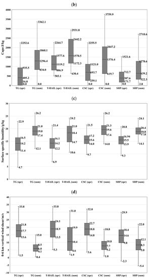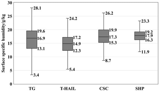 The difference in the surface-specific humidity in spring and summer is noticeable (Figure 8c). The water vapor in summer was more abundant, exceeding 18 g/kg, and the medium value was about 5 g/kg higher than that in spring. The difference between the 25th percentile and the 75th percentile of thermal hail in summer was the greatest, reaching 6.3 g/kg, followed by the thunderstorm gale in spring, reaching 5.1 g/kg. Other types of severe convection were in the range of 2–4 g/kg.
