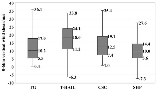 In the deep moist convection with a given humidity, instability and uplift, the enhancement of vertical wind shear will lead to the further strengthening and development of the storm, and the type of storm can be determined to a great extent []. The 0–6 km vertical wind shear is usually used to represent the deep vertical wind shear, representing the organization degree and intensity of the thunderstorm gale. Yu et al. [] defined the value of vertical wind shear of 0–6 km less than 12 m/s as weak deep vertical wind shear, that which is more than 12 m/s and less than 20 m/s as moderate deep vertical wind shear, and that which is greater than or equal to 20 m/s as strong deep vertical wind shear. As shown in Figure 7, the median values of vertical wind shear of 0–6 km in four kinds of severe convective weather are 10.2 m/s, 18.6 m/s, 12.5 m/s and 10.0 m/s, respectively. Short-term heavy precipitation and thunderstorm gales are weak deep vertical wind shear, thermal hail is strong deep vertical wind shear, and compound severe convection is medium deep vertical wind shear. Most thunderstorm gales under the condition of weak vertical wind shear are caused by pulse storms []. The compound effect of evaporative cooling the dry air in the middle and upper layer and the drag of water vapor in the lower layer strengthens the downdraft, leading to thunderstorm gales. Therefore, the vertical wind shear of a thunderstorm gale was lower than that of thermal hail and compound severe convection, and slightly higher than that of short-term heavy precipitation.