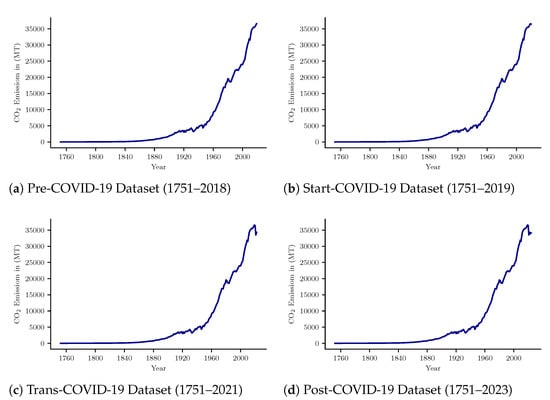 This paper primarily used global annual CO2 emission data from 1751 to 2018. The primary data were retrieved from this repository [36]. These data were then cleaned, engineered and processed. As a result, four sets of data were prepared depending on the occurrence of the COVID-19 pandemic (prior (pre), start, transmission (trans) and post). The data up to December 2018 are called pre-COVID-19 data, the data up to December 2019 are named start-COVID-19 data, the data up to December 2020–2021 are called the trans-COVID-19 dataset and periods after that (e.g., 2022–2023) are called the post-COVID-19 dataset. The time periods trans-COVID-19 and post-COVID-19 are relative periods. If the COVID-19 pandemic globally disappeared in 2021, then post-COVID-19 periods could include 2022; otherwise, we will consider later years for the post-COVID-19 periods. To add phenomenal reality to the data, the time period of 2020 to 2021 is regarded as trans-COVID-19 (since COVID-19 was severely present all over the world). The emissions datasets are shown in Table 2.