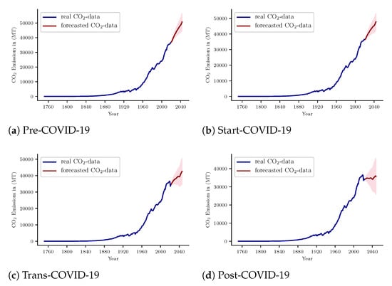 All previous research presented in the literature had projected and modeled CO2 emissions using data collected prior to the COVID-19 pandemic. Without accounting for the effects of COVID-19 on CO2 emissions, predictions might include inaccuracies. This study accounted for COVID-19’s effect on CO2 emissions by including data from the previous declining trend. This yields realistic CO2 emission predictions (up to 2000 MT reduction). Failing to account for COVID-19’s effect on CO2 emissions might make the prediction result more unrealistic (prediction difference is up to 15,000 MT). Mild prediction accuracy can also be observed for the COVID-19 transition period (prediction values up to 7000 MT). All the scenarios can be seen in Figure 6b. Hence, accounting for COVID-19’s effect on CO2 emissions yields realistic future CO2 emission values.