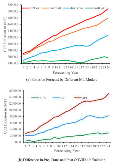 As we have, COVID-19 has decreased CO2 emissions to a significant extent. Here, we quantify the reduction footprint. As seen from Figure 6a, CO2 emissions for the post-COVID-19 case (2022, 2023) are less than 3000 MT to 15,000 MT depending on the years addressed in the forecasting. A similar event can be observed for the transition course (2020, 2021) of COVID-19 (shown in blue). This different forecasting behavior is significant with regard to making a decision concerning developing policies with respect to which model to use for what kind of emission.