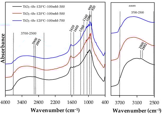 The DRIFT spectra of APTES-modified TiO2 after heat treatment are presented in Figure 1, while reference samples were presented and described in detail in our previous work []. The FT-IR/DR spectra present the same bands typical for TiO2. A wide band from 3700 cm−1 to 2500 cm−1 is assigned to stretching vibrations of surface –OH groups []. As the temperature increases, a decrease in the intensity of these bands can be observed due to the changes in the amount of surface hydroxyl groups []. A narrow band at 1620 cm−1 is associated with the molecular water bending modes []. On all spectra, the presence of the intensive band at around 950 cm−1 was found. This band is characteristic of the self-absorption of titania []. The characteristic bands from APTES are also noted. The bending and stretching contributions of the alkyl groups [(CHn)] are located at around 2900 cm−1 and 2885 cm−1 [,]. However, at 1600 cm−1 the asymmetric –NH3+ deformation modes are observed [,]. At 1360 cm−1, there is a localized low-intensity band ascribed to C−N bonds []. The bands at around 950 cm−1 and 920 cm−1 are characteristic of the stretching vibrations of Ti–O–Si bonds []. These three characteristics of APTES bands are not observed for samples calcined above 300 °C because they were not permanently bonded to the TiO2 surface. However, the band at around 1160 cm−1 and 1080 cm−1 characteristic of the Si−O−Si stretching vibrations and Si–O–C stretching mode, respectively, are noted for all samples [,].