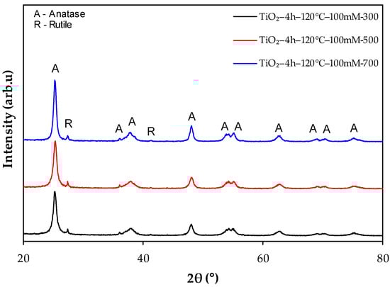The preparation procedure of APTES-modified TiO2 nanomaterials was described in detail in our previous article []. For samples shown in this article, the APTES concentration equals 100 mM. Obtained samples were heated in an argon atmosphere (purity 5.0, Messer Polska Sp. z o.o., Chorzów, Poland) in the GHC 12/900 horizontal furnace (Carbolite Gero, Ltd., Hope, UK). The samples were calcinated at temperatures ranging from 300 °C to 700 °C (Δt = 200 °C) for 4 h. The argon flow was 180 mL/min. After that, the furnace was slowly cooled down to room temperature. Obtained samples are denoted as TiO2-4 h-120 °C-100 mM-Ar-T, where T is the calcination temperature. For comparison, pure TiO2 was also heated at the same temperature. The reference samples were named TiO2-Ar-T,where T is the calcination temperature.