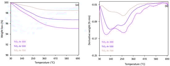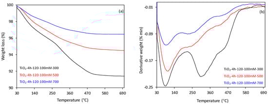 The thermal analysis TG/DTG profiles of the unmodified and APTES-modified samples are illustrated in Figure 3a,b and Figure 4a,b. As can be seen from the recorded curves, the total weight loss for the unmodified samples decreases with increasing calcination temperature reaching 1.95, 1.77 and 0.52%, which is accompanied by the decomposition peaks screened between 30–210 °C, reaching the maximum amount with the DTG peak at ca. 96, 128 and 149 °C, respectively. This mass change is attributed to the vaporization of free water and water bonded to the cations by hydrogen bonding [,]. At the temperature range of 200–390 °C, we observed that a second weight loss can be correlated with the anatase-to-rutile transformation []. In the case of the APTES-modified sample (Figure 4a,b), we can also observe a mass change which is attributed to the removal of physically adsorbed water in the temperature range of 30–170 °C at the maximum at above 90 °C, reaching a weight loss of 3.85, 2.56 and 1.77% for the TiO2-4 h-120-100 mM-300, TiO2-4 h-120-100 mM-500 and TiO2-4 h-120-100 mM-700, respectively.