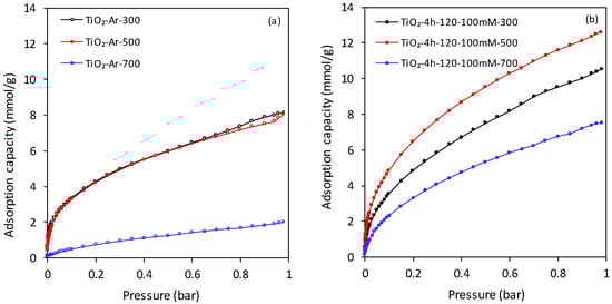 The calculated values of carbon dioxide adsorption capacity at 0 °C for the samples calcined with the various temperatures before and after modification via APTES are summarized in Table 2 and graphically shown in Figure 5a,b. Similar values of the CO2 adsorption capacity (0.36 mmol/g) at 0 °C for an unmodified material were noticed for the samples calcined at 300 °C and 500 °C. The adsorption capacity drastically decreased to 700 °C with the temperature calcination increase and reached 0.09 mmol/g. The decrease in the sorption capacity with the increase in the calcination temperature can be explained by considering the properties of the porous structure of the samples (Table 1). The specific surface area (SBET), total pore volume (Vtotal) and mesopore volume (Vmeso) for TiO2-Ar-300 and TiO2-Ar-500 was 112 m2/g, 0.31 cm3/g, 0.23 cm3/g and 75 m2/g 0.22 cm3/g, 0.19 cm3/g, respectively. In the case of the sample calcined at 700 °C (TiO2-Ar-700), the specific surface area decreased to 23 m2/g, and total pore volume and mesopore volume decreased to 0.10 cm3/g and 0.01 cm3/g, accordingly.