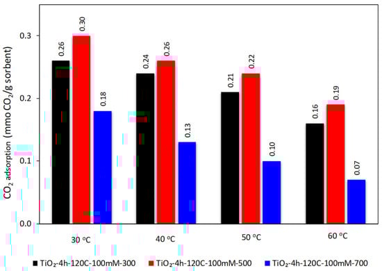 The APTES-modified TiO2 samples were selected for CO2 sorption at different temperatures due to higher CO2 sorption capacity at 0 °C compared to unmodified samples. The results of these experiments are presented in Figure 6. The sorption results at 30, 40, 50 and 60 °C show the same tendency that occurs in the adsorption at 0 °C. From the graph, it can be observed that the effect of increasing the temperature is to decrease the adsorption capacity (what was expected) because it is typical behavior showing the effect of temperature on CO2 adsorption. For instance, the highest CO2 sorption capacity at 30 °C (0.30 mmol/g) exhibited TiO2-4 h-120-100 mM-500 sample, then sorption capacity it reduces by 0,04 mmol/g, 0,06 mmol/g and 0,11 mmol/g when the adsorption temperature increased from 40 °C to 60 °C. This corresponds to an 8%, 12% and 16% decrease compared to the CO2 adsorption capacity at 30 °C. This can be explained by the fact that an increase in adsorption temperature stands for high gas molecule energy. Increasing energy allows gaseous molecules to diffuse at a greater rate, in turn reducing the chance for the CO2 to be restrained or trapped by fixed energy adsorption sites on the adsorbent surface [,,,].