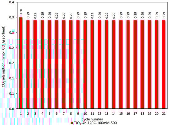 The cyclic adsorption-desorption behavior was carried out for the TiO2-4 h-120-100 mM-500 sample that achieved the highest CO2 sorption capacity at both 0 °C and 30, 40, 50 and 60 °C among all APTES-modified TiO2 samples and calcined with various temperatures. The calculated CO2 capacities during twenty-one consecutive adsorption-desorption cycles at 30 °C are shown in Figure 7. It could be seen that the CO2 adsorption capacity shows excellent cyclic stability and regenerability after 21 adsorption-desorption cycles, which is crucial for practical application.
