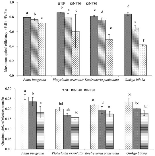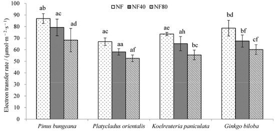 The change in electron transfer rate (ETR) of the different tree species under ozone stress is shown in Figure 2. There were significant differences between the different ozone treatments (p < 0.05). The ETR of the different tree species decreased with the increase in ozone concentration. Under the control of the different ozone concentrations NF, NF40 and NF80, the values of ETR of P. bungeana were 86.92 ± 4.23 μmol·m−2·s−1, 79.25 ± 7.22 μmol·m−2·s−1 and 68.27 ± 10.13 μmol·m−2·s−1, respectively. Compared with the ozone concentration of NF, the values of ETR of P. bungeana decreased by 7.67 μmol·m−2·s−1 and 18.65 μmol·m−2·s−1, respectively. Under the control of the different ozone concentrations NF, NF40 and NF80, the ETR values of P. orientalis were 66.97 ± 3.23 μmol·m−2·s−1, 58.08 ± 2.77 μmol·m−2·s−1 and 52.58 ± 2.86 μmol·m−2·s−1, respectively. Compared with the ozone concentration of NF, the values of ETR of P. orientalis decreased by 8.88μmol·m−2·s−1 and 14.39 μmol·m−2·s−1, respectively. Under the control of the different ozone concentrations NF, NF40 and NF80, the values of ETR of K. paniculata were 73.56 ± 1.39 μmol·m−2·s−1, 65.23 ± 6.16 μmol·m−2·s−1 and 55.47 ± 4.24μmol·m−2·s−1, respectively. During the whole experiment, the values of ETR of K. paniculata decreased by 11.34% and 24.59%. Under the control of the different ozone concentrations NF, NF40 and NF80, the values of ETR of G. biloba were 78.66 ± 6.79 μmol·m−2·s−1, 67.48 ± 5.27 μmol·m−2·s−1 and 60.14 ± 4.18 μmol·m−2·s−1, respectively.