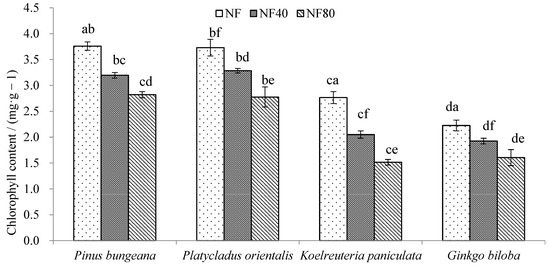 The change in chlorophyll content of the different tree species under ozone stress is shown in Figure 3. There were significant differences between the different ozone treatments (p < 0.05). The chlorophyll content of the different tree species decreased with the increase in ozone concentration. Compared with the ozone concentration of NF, the chlorophyll content of P. bungeana decreased by 0.56 mg·g−1 and 0.84 mg·g−1 under the ozone concentrations of NF40 and NF80, respectively. Under the ozone concentrations NF, NF40 and NF80, the chlorophyll contents of P. orientalis were 3.73 ± 0.16 mg·g−1, 3.29 ± 0.04 mg·g−1 and 2.78 ± 0.20 mg·g−1, respectively. Under the NF40 and NF80 ozone concentrations, the chlorophyll content of P. orientalis decreased by 11.93% and 25.60% respectively. Under the ozone concentrations of NF, NF40 and NF80, the chlorophyll contents of K. paniculata were 2.77 ± 0.12 mg·g−1, 2.05 ± 0.07 mg·g−1 and 1.52 ± 0.06 mg·g−1, respectively. Under the ozone concentrations of NF40 and NF80, compared with the ozone concentration of NF, the chlorophyll contents of K. paniculata were reduced by 0.72 mg·g−1 and 1.25 mg·g−1, respectively. During the whole test period, the chlorophyll contents of K. paniculata decreased by 25.86% and 45.21%, respectively under the ozone concentrations of NF40 and NF80. The chlorophyll contents of G. biloba were 2.23 ± 0.11 mg·g−1, 1.93 ± 0.05 mg·g−1 and 1.61 ± 0.16 mg·g−1 under the control of the different ozone concentrations of NF, NF40 and NF80.