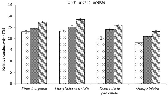 The relative conductivity of the four tree species increased with the increase in ozone concentration (Figure 4). There were significant differences between the different ozone treatments (p < 0.05). Under the different ozone concentrations, the values of relative conductivity of P. bungeana were 22.99 ± 0.65% (NF), 24.52 ± 0.06% (NF40) and 27.39 ± 0.51% (NF80). Under the ozone concentrations NF40 and NF80, the relative conductivity values of P. bungeana increased by 1.53% and 4.40%, respectively, compared with that of NF. During the whole experiment, the relative conductivity values of P. bungeana increased by 6.22% (NF40) and 16.05% (NF80). Under the control of the different ozone concentrations NF, NF40 and NF80, the values of relative conductivity of P. orientalis were 23.23 ± 0.35%, 25.17 ± 0.52% and 28.47 ± 0.50%, respectively. Under the ozone concentrations NF40 and NF80, the relative conductivity values of P. orientalis increased by 1.94% and 5.24%, respectively, compared with the ozone concentration of NF. During the whole experiment, the relative conductivity values of P. orientalis increased by 7.71% and 18.41% under the ozone concentrations of NF40 and NF80, respectively. Under the different ozone concentrations NF, NF40 and NF80, the relative conductivity values of K. paniculata were 20.21 ± 0.63%, 24.01 ± 0.57% and 26.08 ± 0.39%, respectively. Compared with the ozone concentration of NF, the relative conductivity value of K. paniculata increased by 3.80% and 5.87%, respectively. Under the different ozone concentrations NF, NF40 and NF80, the values of relative conductivity of G. biloba were 18.45 ± 0.30%, 21.00 ± 0.15% and 23.13 ± 0.55%, respectively.