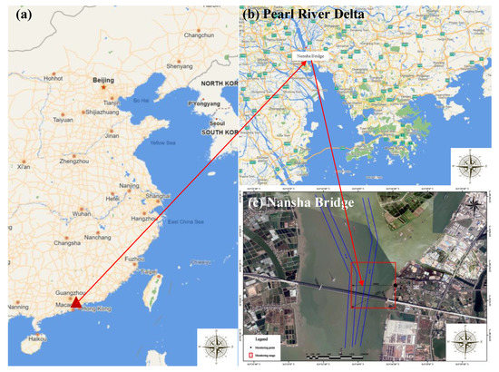 Figure 1. (a) The location of the Pearl River Estuary. (b) The area of the Pearl River Estuary. (c) The area and scope monitored by UAVs.