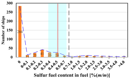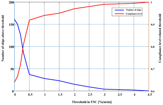 Figure 4 shows the distribution of the number of ships exceeding the corresponding FSC threshold and the level of fuel compliance for all monitored ships. In Figure 4, the X-axis represents the FSC range of all tested ships, the blue curve represents the number of ships whose FSC is greater than the corresponding threshold, and the red curve represents the compliance rate level of all tested ships whose FSC is less than the corresponding threshold. According to the different FSC thresholds, different compliance levels could be obtained. If an FSC threshold of 0.5% (m/m) was used, 37 non-compliant ships were observed, corresponding to a compliance level of 92% and a non-compliance level of 8%. Accounting for sensor error (accuracy and bias), if the FSC threshold of 0.7% (m/m) was used, which seemed to be the more correct approach, 28 ships were found to be non-compliant, which corresponded to a compliance level of 93.7% and a non-compliance level of 6.3%. A global cap on the FSC in marine fuel was reduced to 0.5% (m/m) in 2020 and has already been implemented in China. According to our monitoring results, to some extent, the current situation for meeting the 0.5% (m/m) limit is basically optimistic. Compared with the monitoring results of Wvr et al. in the Belgian North Sea area, the compliance rate was 92% [31], which is basically similar to the monitoring results in the Pearl River Delta in this paper. The results represent the effectiveness of the DECA policy implementation, and can reflect the achievements of international ports around the world after the implementation of ECA.