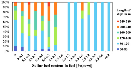 The comparison of compliance levels between ship lengths is shown in Figure 5. The length of the ship in steps of 40 m is color coded in Figure 5. It can be seen from Figure 5 that ships with lengths less than 80 m basically did not use fuel with a sulfur content higher than 0.5% (m/m), which was likely because their engines could not handle HSFO. The FSC of 28 ships was suspected of violating IMO regulations; 25 ships were 80–120 m in length, 2 ships were 120–160 m in length, and 1 ship was 200–240 m in length. It can be concluded that the violation rate of small seagoing ships was high, and most of the violation ships were about 80–160 m long, which provides a general direction for MLE in the future.