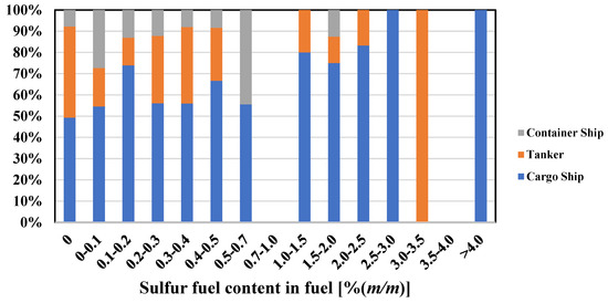 The ship type of the monitored ships was mainly divided into cargo ships, tankers and container ships. The comparison of compliance levels between ship types is shown in Figure 6. A total of 445 ships were monitored in the experiment, including 244 cargo ships, 159 tankers, and 42 container ships. 28 ships were suspected of violating fuel sulfur content regulations. Among them, 23 were cargo ships, 4 were tankers and 1 was a container ship. When comparing compliance levels between cargo ships, tankers, and container ships, a relatively higher level of non-compliance was observed for cargo ships, while the violation rate of container ships was the lowest. It can be concluded that the probability of exceeding 0.5% (m/m) of FSC for cargo ships was very high.