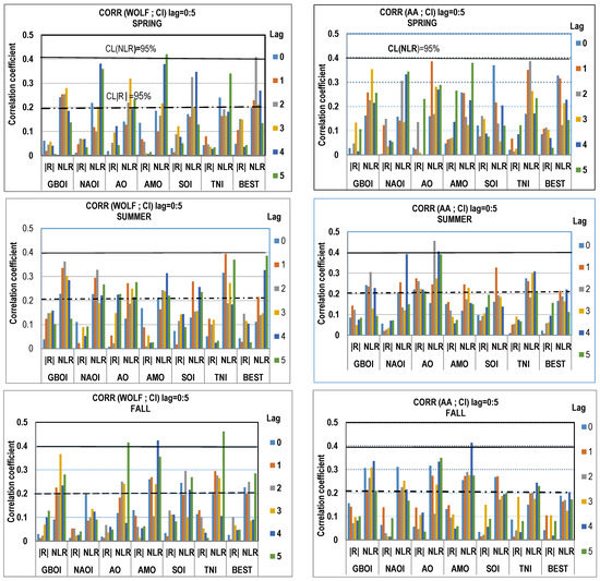 During the autumn season, for the relationship with the Wolf number, there are three cases when NLR has significance higher than 95%, namely, AO at a lag of 5 years, AMO at a lag of 4 years and TNI at a lag of 5 years. For correlations with aa, there is only one situation for which a relationship with the Wolf number was found, which was at AMO for a lag of 4 years.