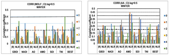 As was mentioned in the data section, to investigate the connection between solar/geomagnetic activity and climate indices, linear and non-linear approaches between predictors and predictands have been applied on each season with a lag from 0 to 5 years. First, we will present and analyze the results obtained by comparing the NLR correlation coefficients with those obtained by classical Pearson correlations (|R|). Therefore, the linear and non-linear correlation coefficients between the Wolf number/aa geomagnetic index and climate indices for each individual season and with lag from 0 to 5 years are presented by comparison in Figure 1. It should be mentioned that inside all Figures, aa is written in capital letters, meaning AA.