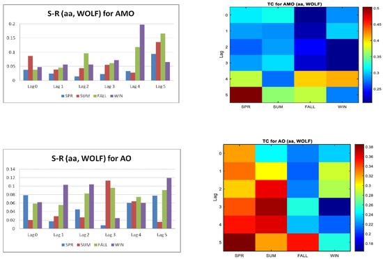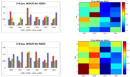 For the first climate index considered in the present study, GBOI, the highest values of S-R accompanied by high TC are during the summer at a lag of 2 years. Regarding the NAOI, the analysis of both S-R and TC values indicates that the influence of two sources on NAOI is during the summer at lags of 2 and 3 years. For AMO, the R-S value at lag 4 in winter differs from the other values and because of the relatively high TC associated with it, we conclude that both the solar and geomagnetic indices can be considered together to be significant predictors. Regarding AO, for summer with a lag of 3 years, the two predictors can be considered together. For BEST, during the fall with a lag of 2 years, the two predictors bring together their contribution to the variability of this climate index. For SOI, we can consider that both in the spring and summer seasons, the two predictors, taken with a lag of one year before, can be considered significant predictors. Taking into account both the R-S and TC values, for TNI, during the summer, after five years, the two predictors considered together can influence the behavior of this index. At this stage, it should be mentioned that the appearance of high linear/non-linear correlations between solar variability and climate with certain lags might not be unexpected, keeping in mind the complexity and non-linearity of climate systems and of their external and internal forcings. Various periodicities in solar variability indices and climate indices, for instance, could result in such lags. The physical mechanisms that are behind these lags are beyond the scope of this study. However, an explanation of the physical mechanism of correlations with certain lags between solar activity and climate variables can be found in certain studies (Gray et al. [16]; Drews et al. [49]; Scaife et al. [102]; Thiéblemont et al. [103]; Chen et al. [104]).
