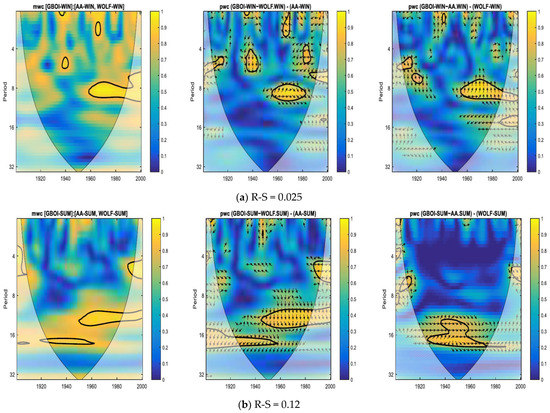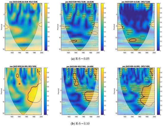 Figure 4a,b show the results obtained by wavelet analysis for NAOI in summer with low R-S (0.05) and a relatively high R-S (0.10) situation found in winter, with both cases at lag = 0. If for summer, the wavelet analysis highlights only isolated cases with significant coherence, in the case of winter (Figure 4b), both the mwc and pwc highlight a significant coherence, and between NAOI in winter and solar/geomagnetic indices, for periods around the 11-year solar cycle (Schwabe) after the 1970s. This significant coherence after the 1970s could either be because of changes of NAO (Beniston and Jungo) [42], or because of certain changes that had taken place in the so-called “top-down” and “bottom-up” of the solar influence mechanisms, as shown in (Gray et al.; Lin et al.; Kuroda et al.) [107,108,109].
